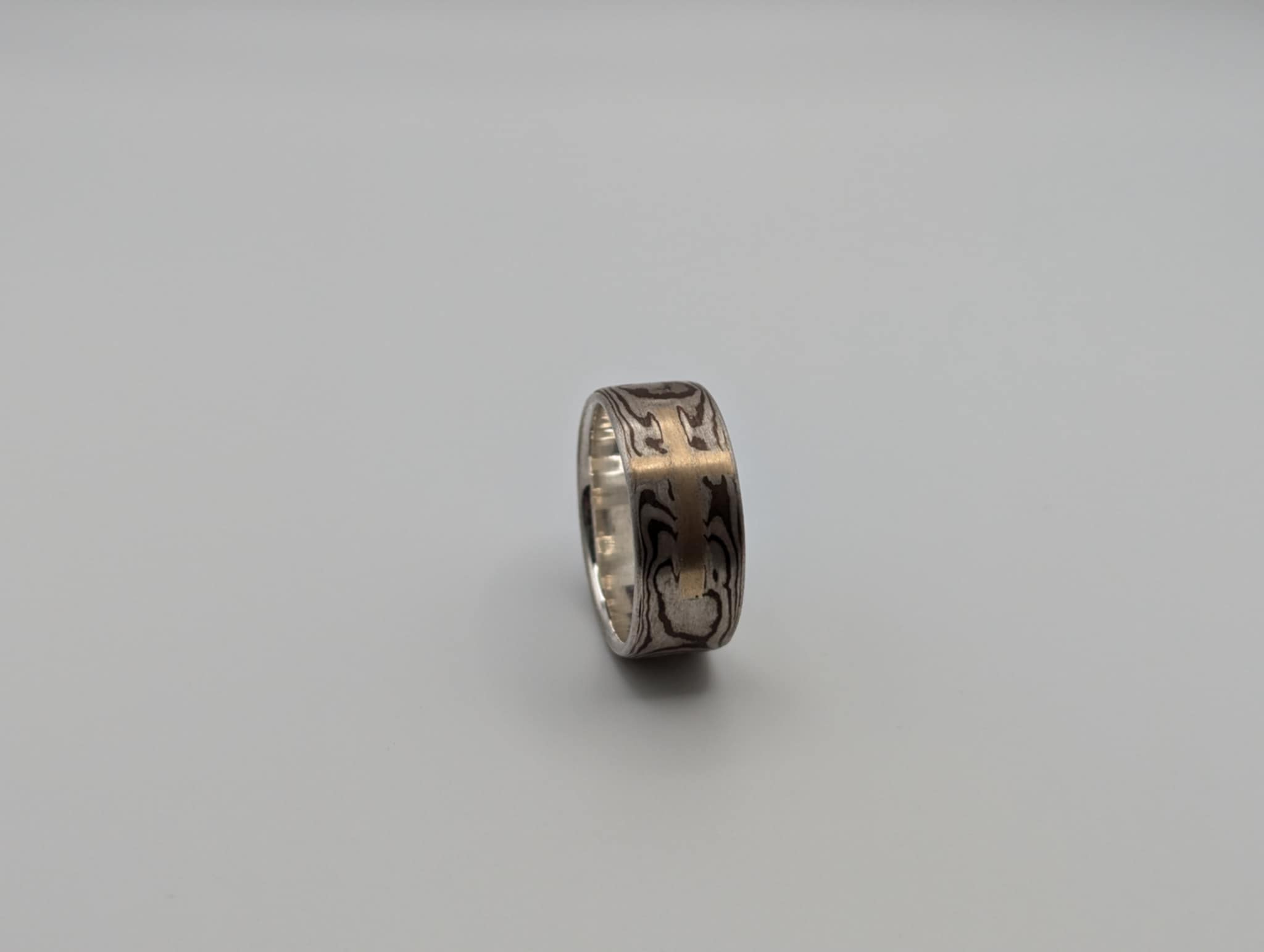 Jonc mi-large unisex avec croix or 14kt Mokumé Gané, Forgé à la main par artisan local
